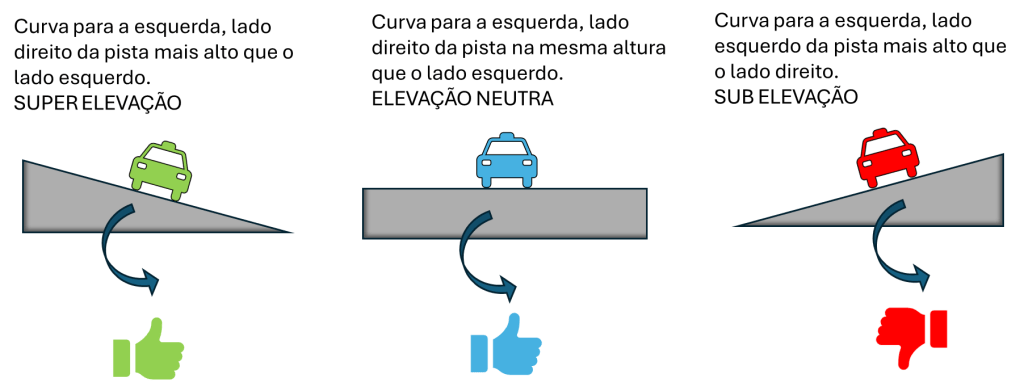 Como resultado, os veículos são “empurrados” para o lado externo das curvas (ação da força centrípeta) e derrapam, mesmo com o asfalto novo, causando os acidentes. Esta inclinação negativa também afeta a força normal, com efeito direto na redução do atrito (pneu/asfalto), contribuindo ainda mais para a insegurança da via. Se estiver chovendo, o problema se agrava.